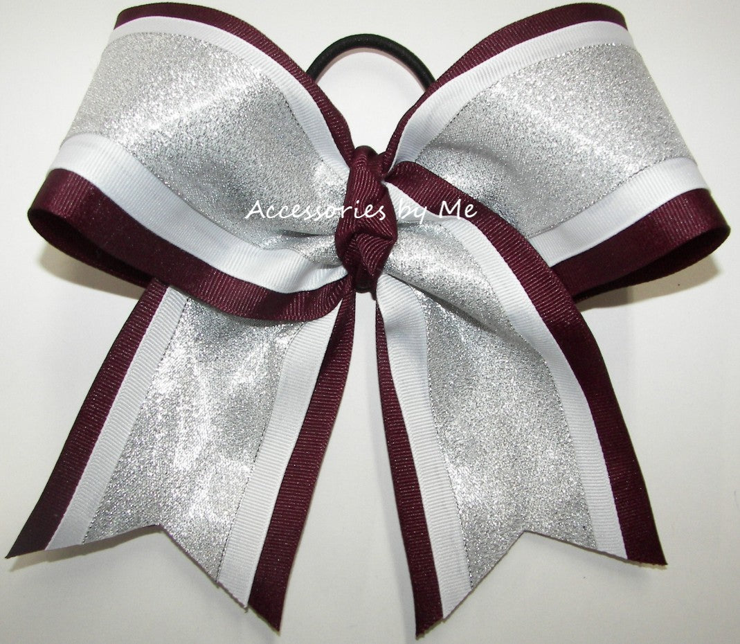 **Custom Cheer Bow. Switch out the 3" Maroon ribbon shown for your team color choice layered with the 2 1/4" White ribbon and Silver Metallic Ribbon. *Choose 3" ribbon color in the drop down menu.
