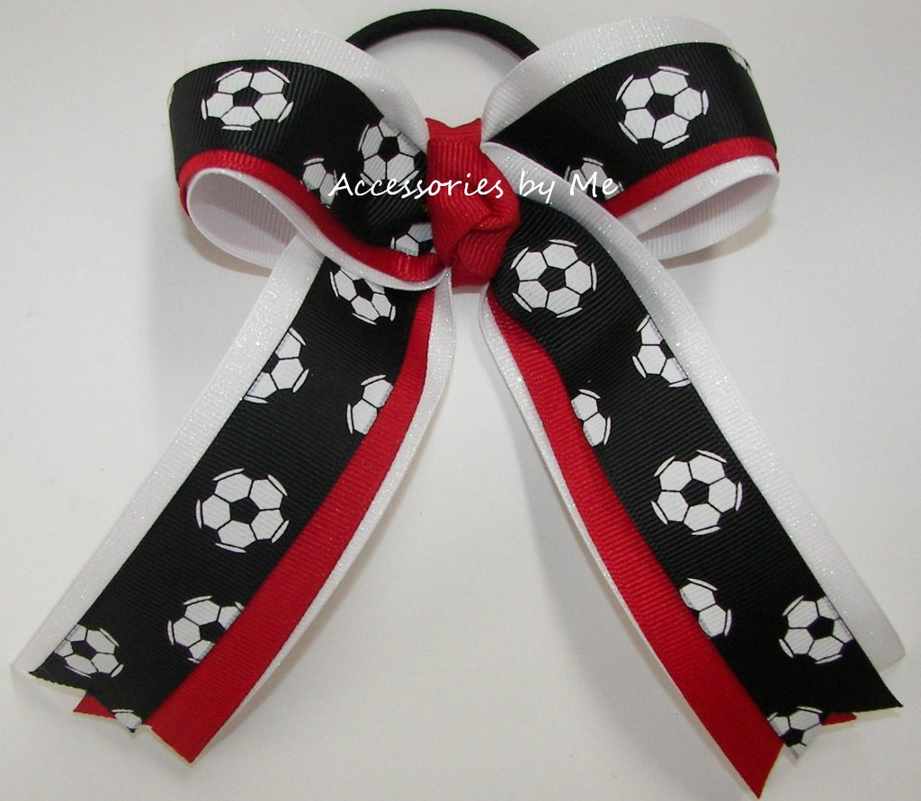 **Custom Soccer Bow. Switch out the Red shown for your team color choice layered with the black soccer print ribbon and White Glitter ribbon. Choose team color from drop down.