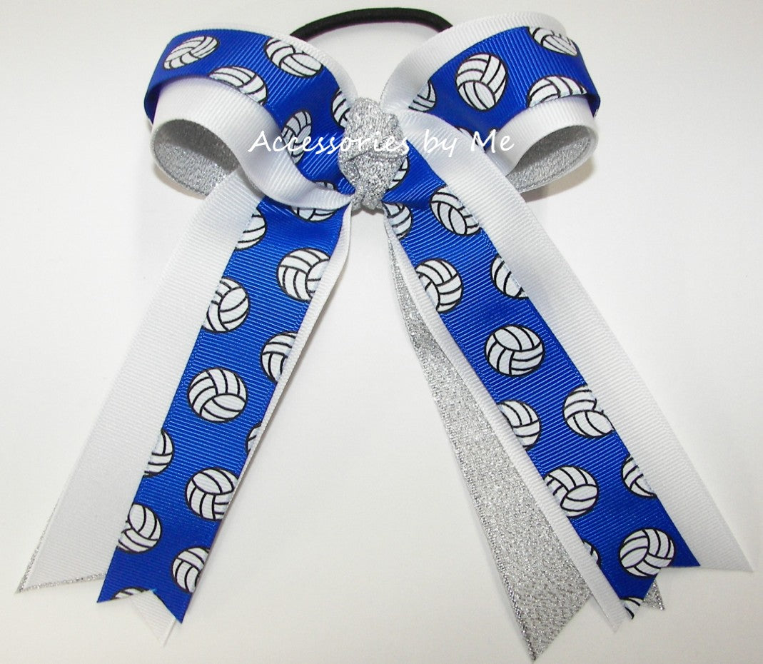 Volleyball Royal Blue White Silver Metallic Ponytail Holder Bow