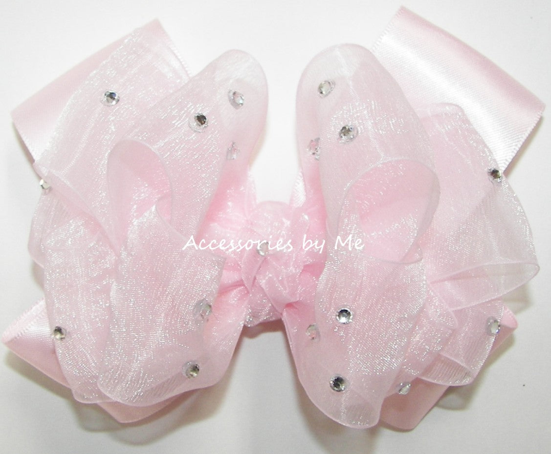 Light Pink Organza Satin Bows Hand Set Embellished with Clear Rhinestones. Bows are sewn to Cuff of White Socks.